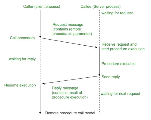 MERK: RPC er spesielt godt egnet for klient-server (f.eks. spørring-svar) interaksjon der flyten av kontroll veksler mellom den som ringer og den som ringer . Konseptuelt kjører ikke klienten og serveren begge samtidig. I stedet hopper utførelsestråden fra den som ringer til den som ringer og deretter tilbake igjen.