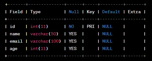 CREATE TABLE users ( id INT PRIMARY KEY, name VARCHAR(50), email VARCHAR(100), age INT ); DESC users;>